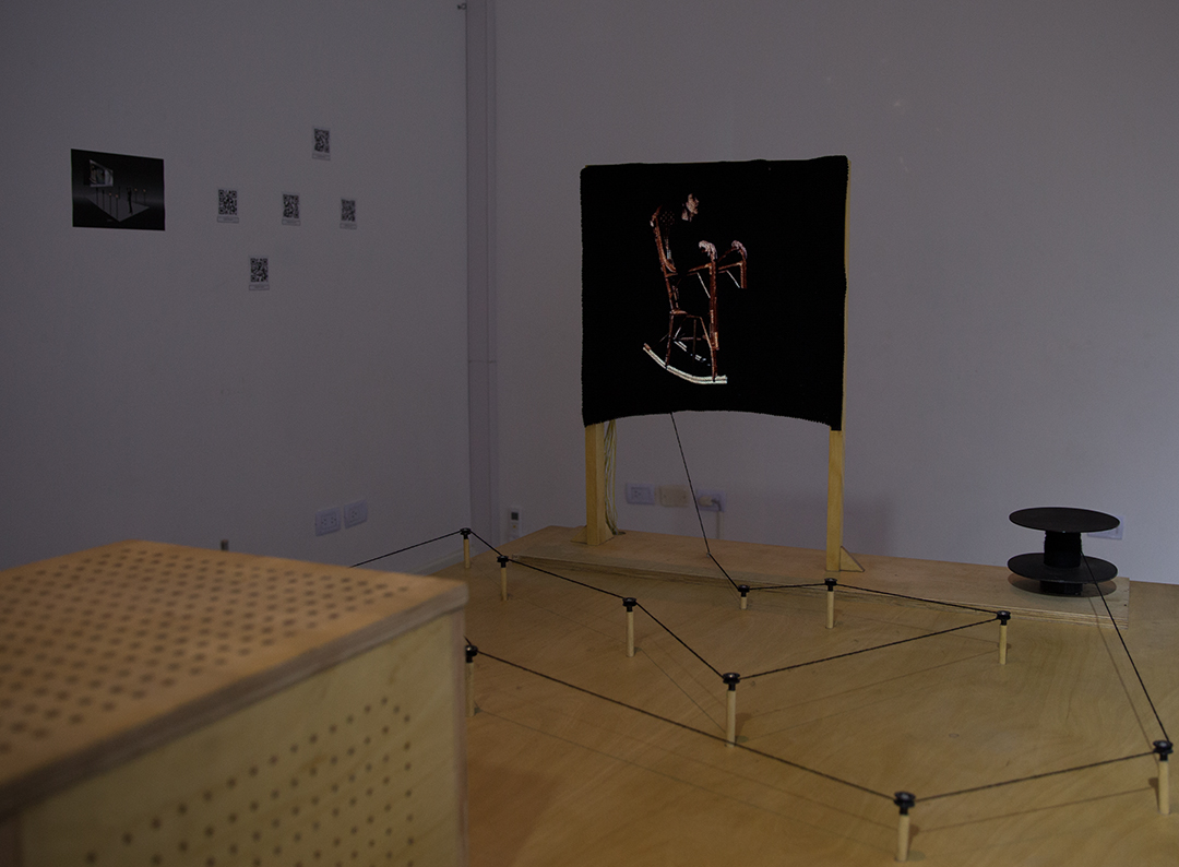 Nel cuore della mostra si incontra “De fallacie perceptione”, un’installazione meccanica che esplora la smaterializzazione del supporto visivo e l’effimerità della percezione. Un pannello tessuto a mano e montato su un telaio di legno viene lentamente srotolato dal basso verso l’alto da un sistema motorizzato. Questo atto meccanico di sfilamento rivela e allo stesso tempo nasconde una proiezione video che evoca il monologo teatrale “Rockaby” di Samuel Beckett del 1981. In questo monologo il drammaturgo affronta il tema dell’alienazione e della dissociazione della personalità per esprimere l’incomunicabilità e gli effetti dell’individualizzazione delle società.
