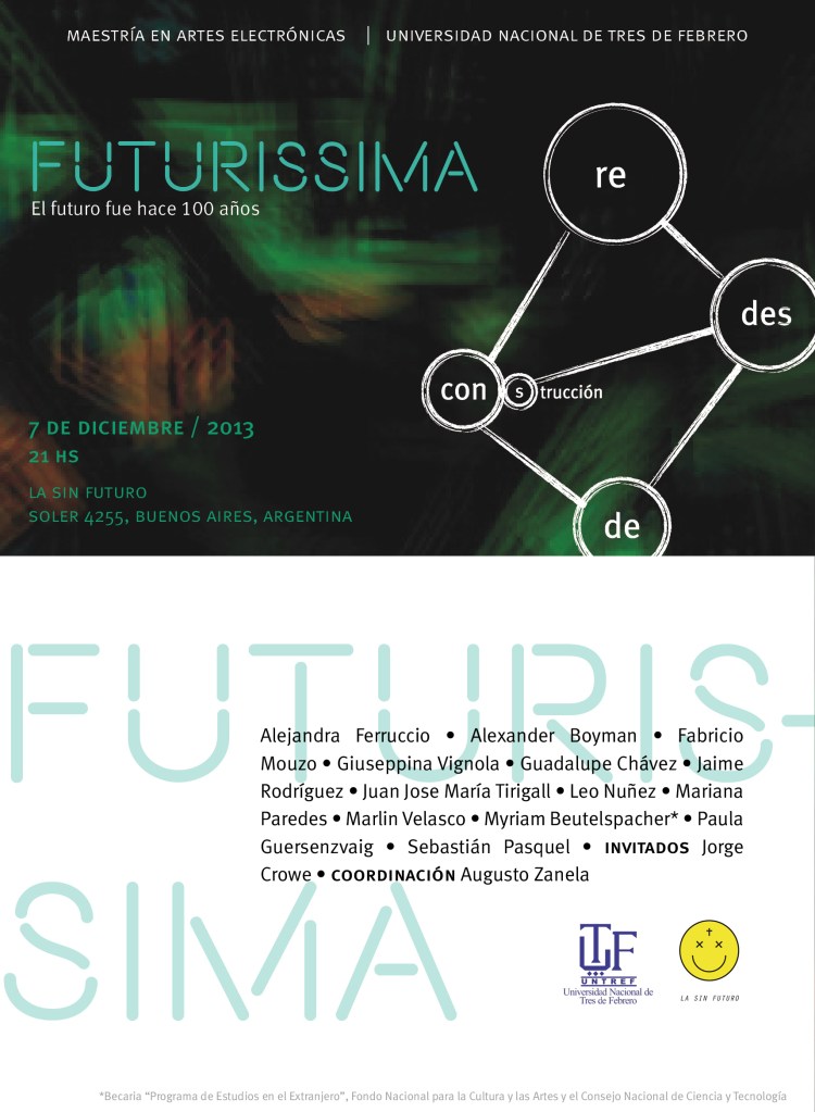 La mostra collettiva Futurissima è stata allestita nel mese di dicembre 2013 a Buenos Aires, presso La Sin Futuro, luogo di circolazione artistica con sede in una casa che è stata demolita dopo poco l’esposizione. Alla mostra hanno partecipato tutti gli alunni del Master in Tencologia ed Estetica delle Arti Elettroniche dell’anno accademico 2013, i quali hanno lavorato in equipe divisi in gruppi per la curatela, per il montaggio in sala, per la prouzione e per la grafica e la comunicazione. In occasione della mostra è stata ideata e realizzata l’installazione sonora Rockaby (hic et nunc), programmazione su piattaforma Arduino e Processing, circuito elettronico con multiplexer.